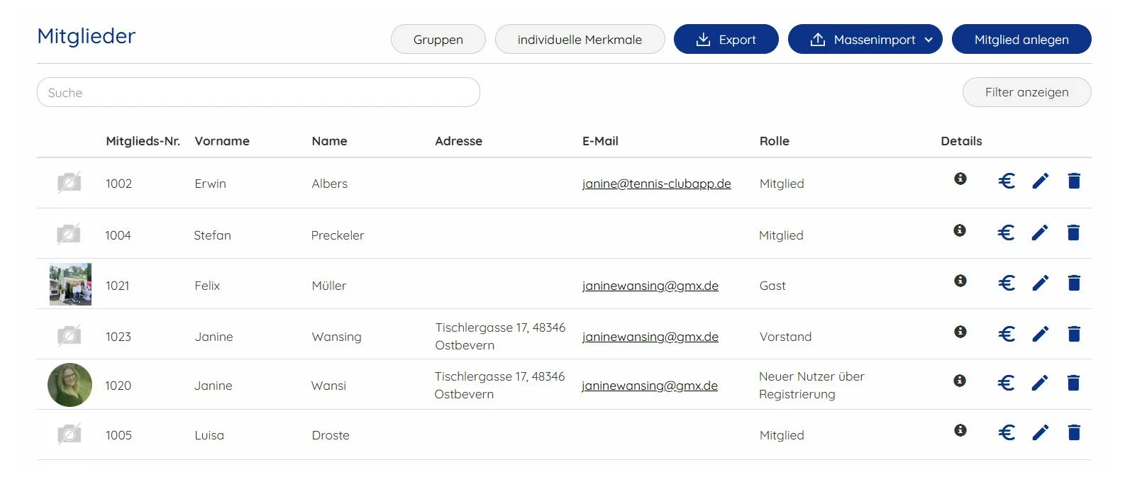 Hier habt ihr eine vollwertige Mitgliederverwaltung, in der ihr eure Vereinsmitglieder pflegen und verwalten könnt. Die Mitgliederdaten wie Name, Adresse, Telefonnummer und Mitgliedsstatus können einfach und bequem verwaltet werden. Über "individuelle Merkmale" könnt ihr weitere Merkmale/Felder anlegen, die ihr dann an den jeweiligen Mitgliedern befüllen könnt. Somit könnt ihr eure Mitgliederverwaltung flexibel erweitern.